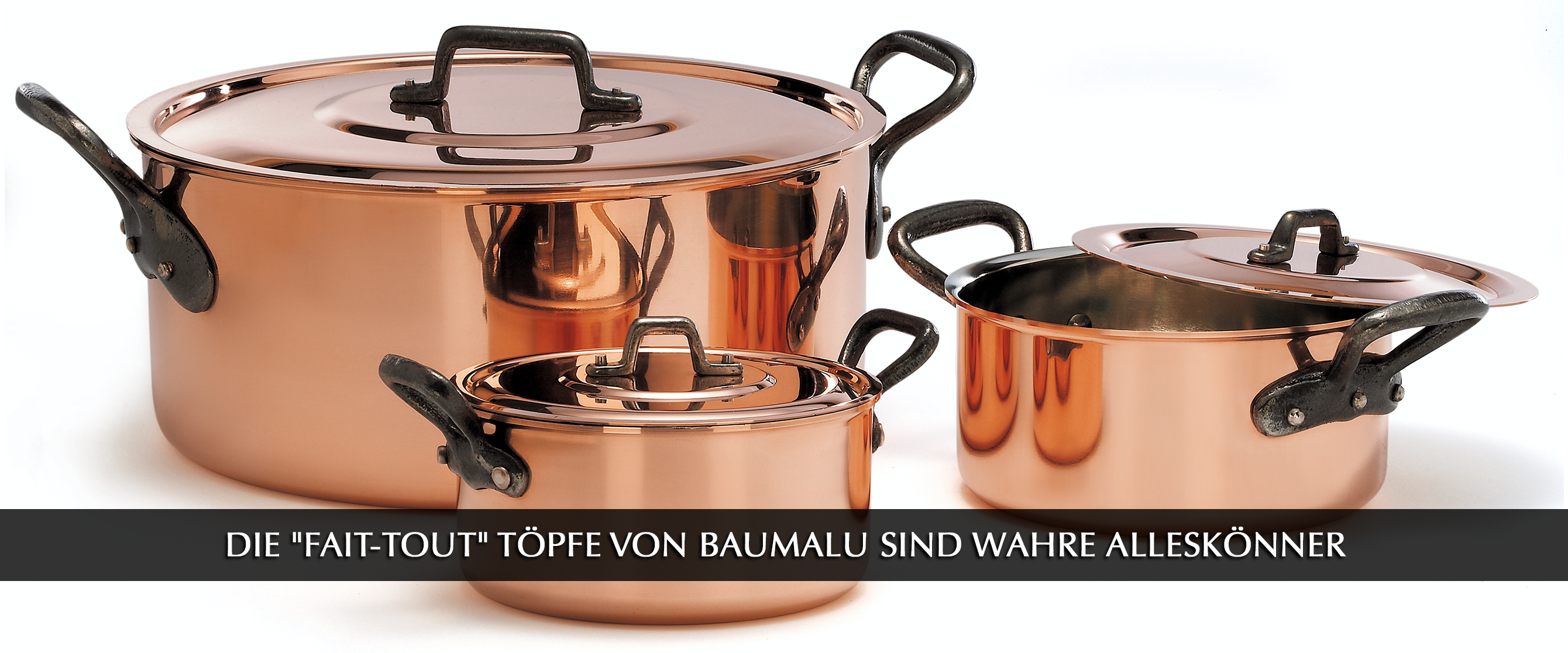 Unsere beiden Lieferanten für unsere Kupferprodukte BAUMALU aus dem Elsaß und de Buyer aus den Vogesen in Ostfrankreich, vereinen in ihrer Arbeit höchste qualitative und ästhetische Ansprüche mit Tradition und Handwerkskunst. Deren Produkte ergänzen sich einander wunderbar in jeder Küche: BAUMALU als Hersteller von den traditionellen verzinnten Kupfertöpfen und mit der neuen Serie “Céracuivre“ lassen sich sehr gut mit den modernen Kupfer-Edelstahl-Töpfen und der berühmten und induktionsfähigen Serie “Prima Matera“ von de Buyer ergänzen.